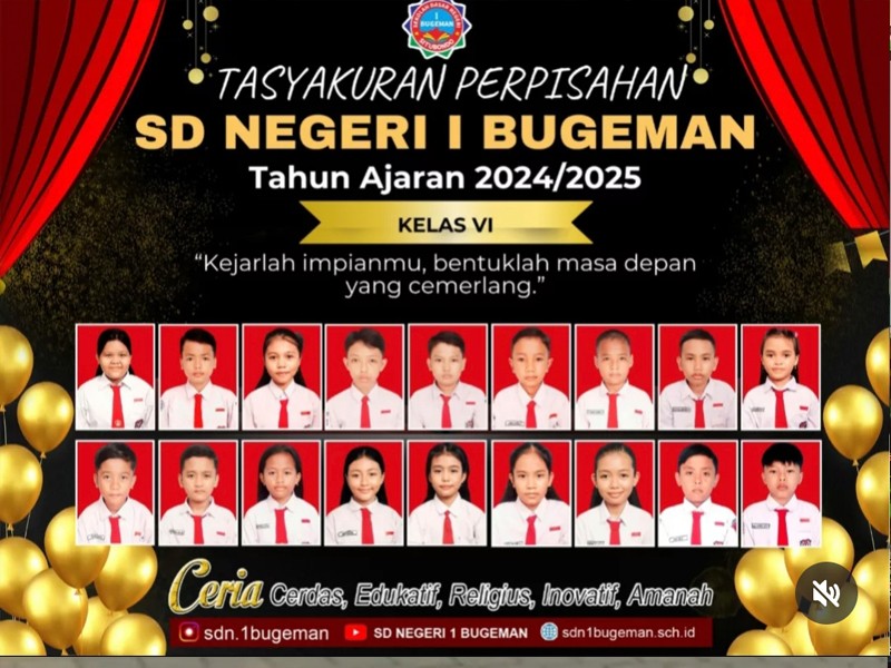 Tanggal 18 Juni 2025, SD NEGERI I BUGEMAN mengadakan Tasyakuran perpisahan siswa siswi kelas VI angkatan 2024/2025 dengan tema “ Kejarlah Impianmu, Bentuklah Masa Depanmu yang Cemerlang” Acara dihadiri oleh Siswa, Wali Murid, Komite Sekolah, Dewan Guru dan Bapak Pendamping Satuan Pendidikan.